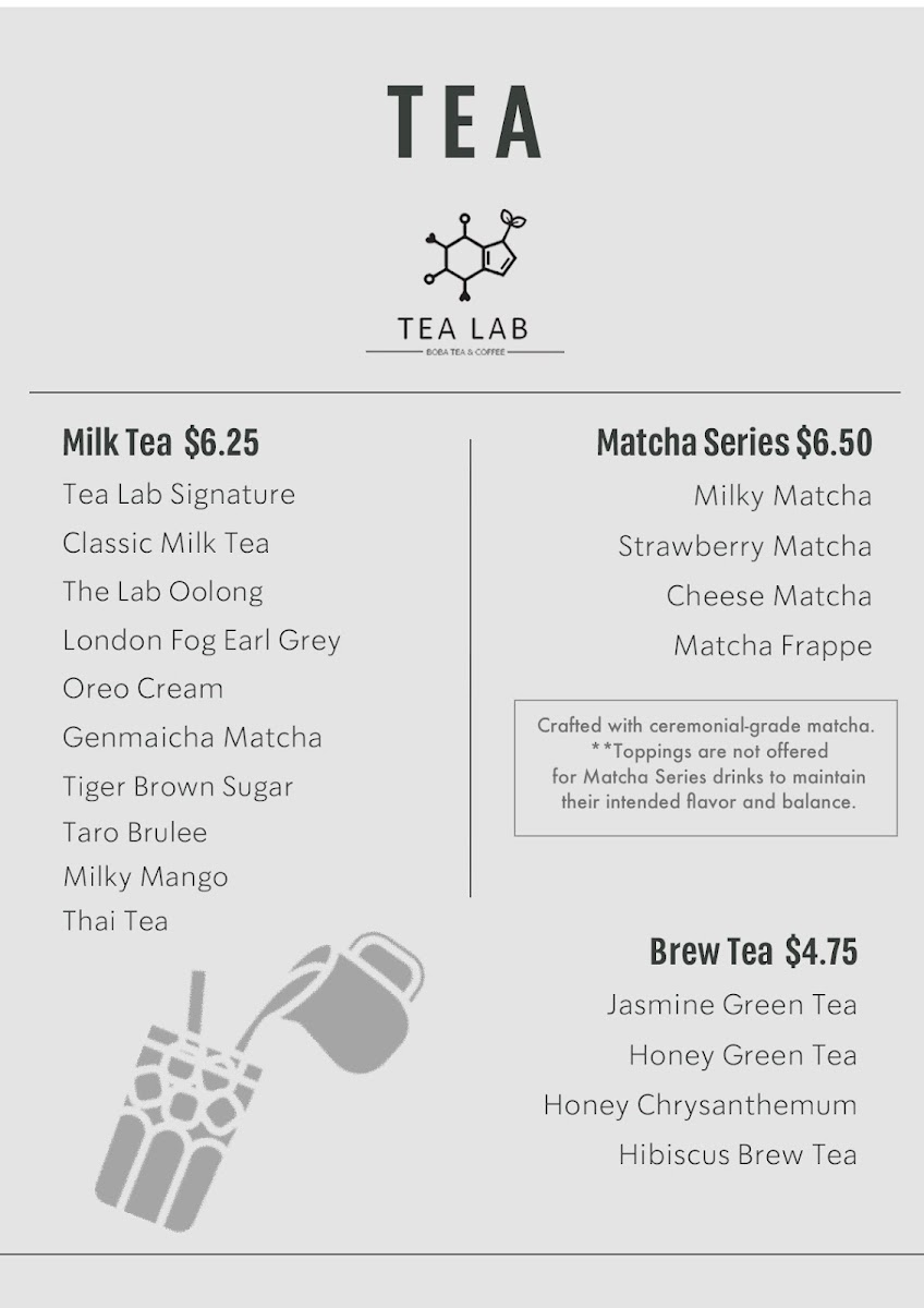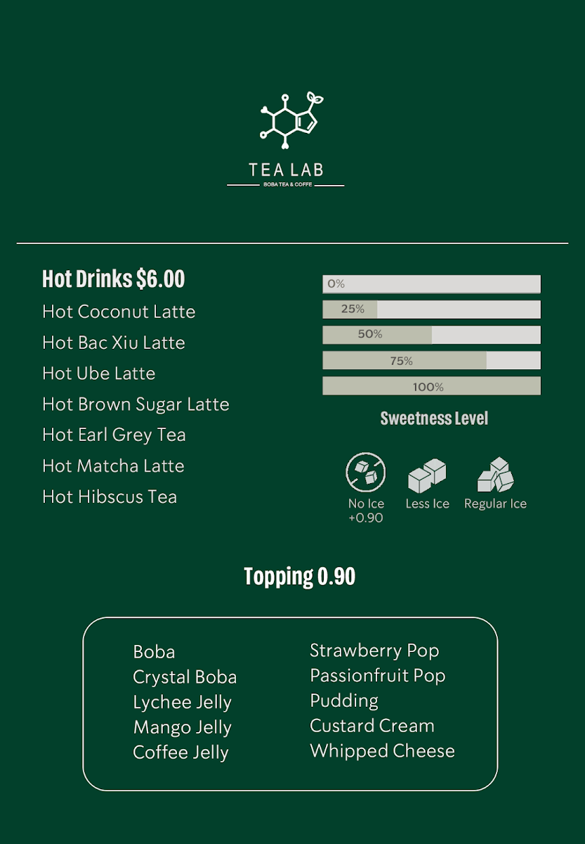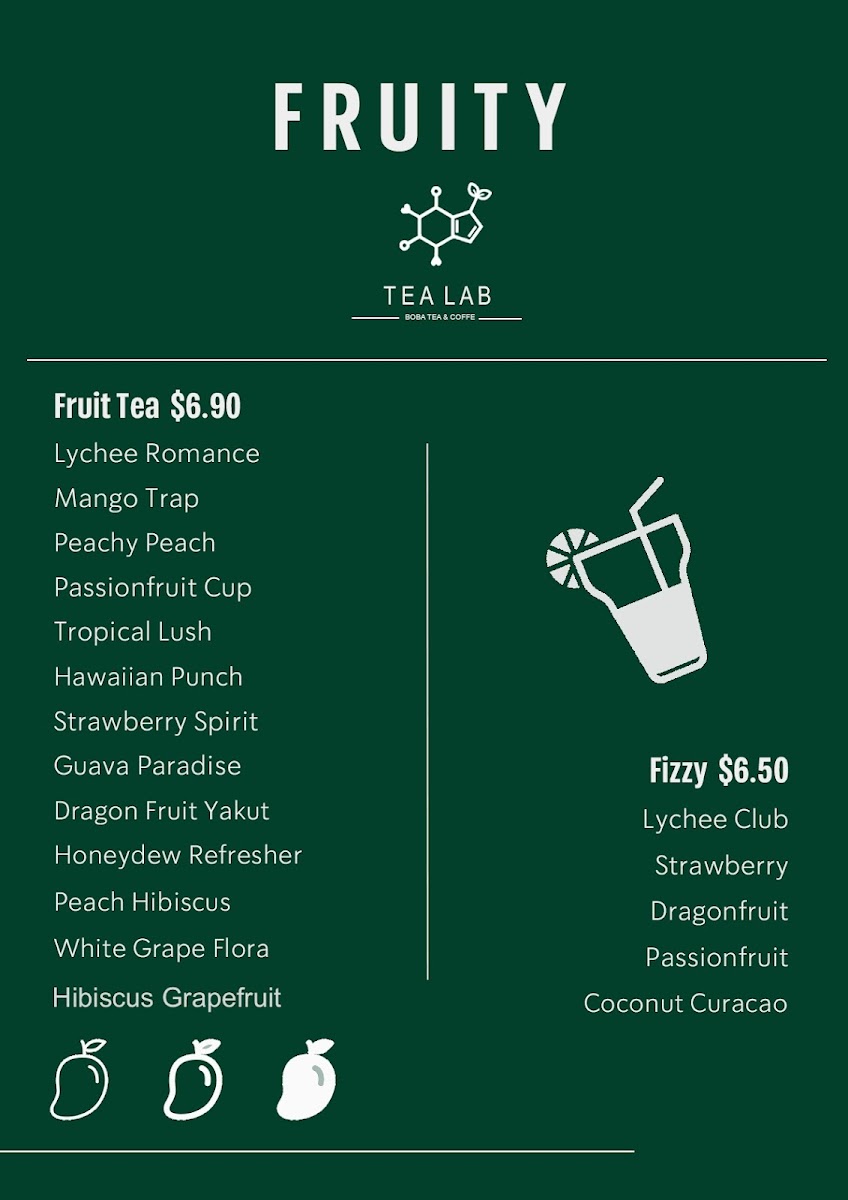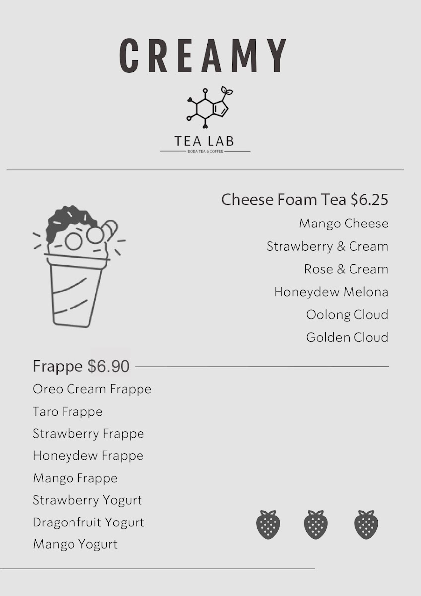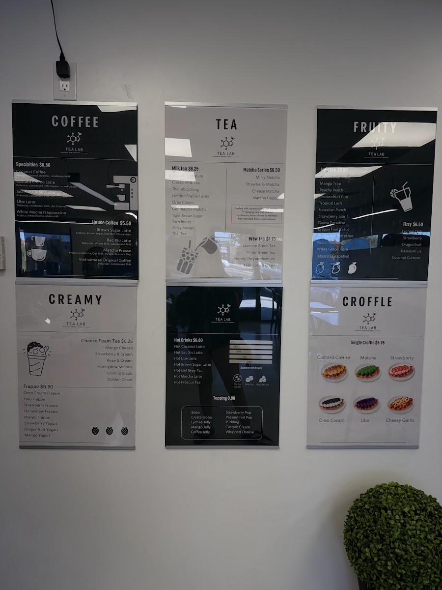Tea Lab’s menu offers a vibrant array of beverages, blending refreshing fruit teas, fizzy drinks, frappés, milk teas, cheese teas, and coffee creations. Their Fruit Teas include tropical options like Tropical Lush, Guava Paradise, and Passion Fruit Cup, alongside Honeydew Refresher and Lychee Romance. For those seeking a fizzy twist, the Yuzu Fizzy, Strawberry Fizzy, and Lychee Club are standout choices, with Dragon Fruit Fizzy adding an exotic touch. Tea lovers can indulge in creamy Frappés such as Matcha Frappé, Strawberry Yogurt, and Mango Yogurt, or enjoy more indulgent options like Strawberry Frappé and Taro Frappé. For a milk tea experience, Classic Milk Tea, Taro Brûlée, and Milky Matcha are top picks, along with unique offerings like Oreo Cream and Milky Mango. The Cheese Teas showcase rich flavors like Rose & Cream, Mango Cheese, and Strawberry & Cream, with the bold Cheese Matcha as a standout. The Coffee section features inventive drinks like Ube Latte, Brown Sugar Latte, and Vietnamese Original Coffee, while those craving something a bit different can try the Custard Cream Latte or the strong Matcha Presso. For a more traditional tea experience, Jasmine Green Tea, Honey Green Tea, and Oolong Brew Tea provide a soothing, aromatic option. Tea Lab’s diverse menu ensures there’s something for everyone, whether you’re craving something fruity, creamy, or caffeinated.
