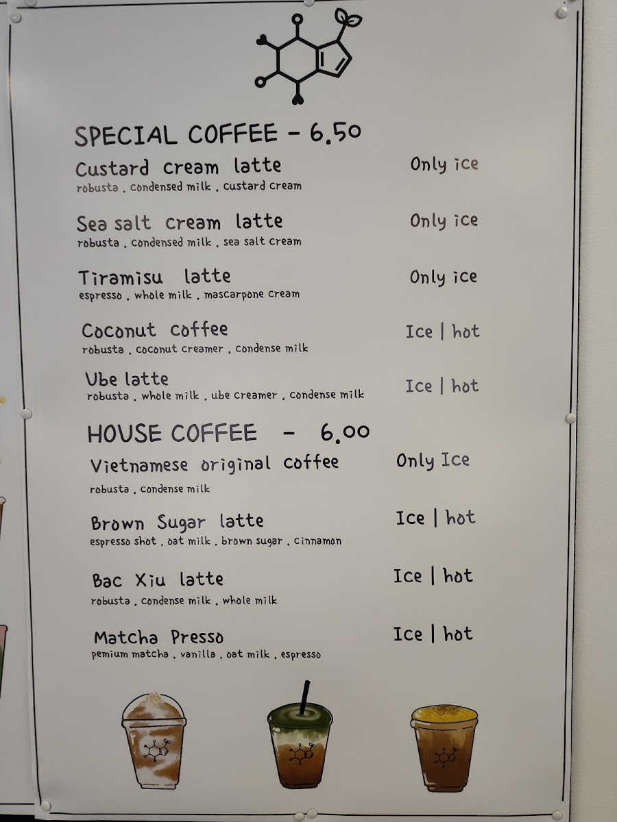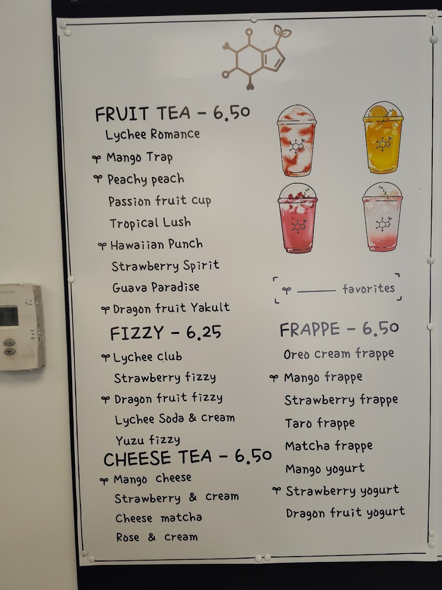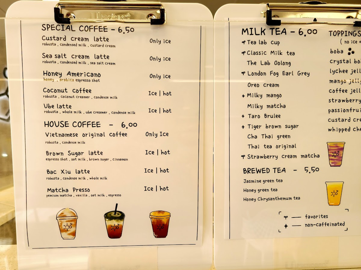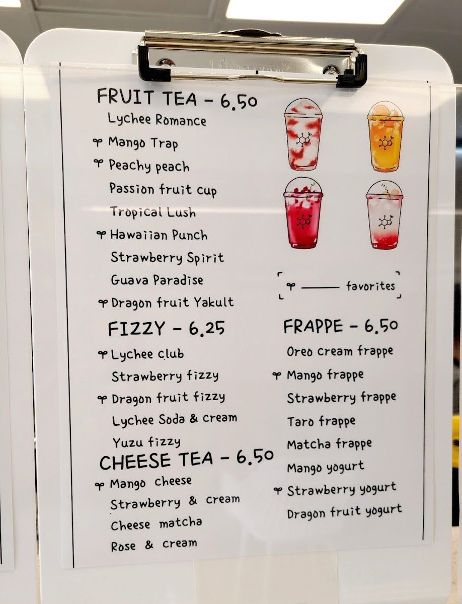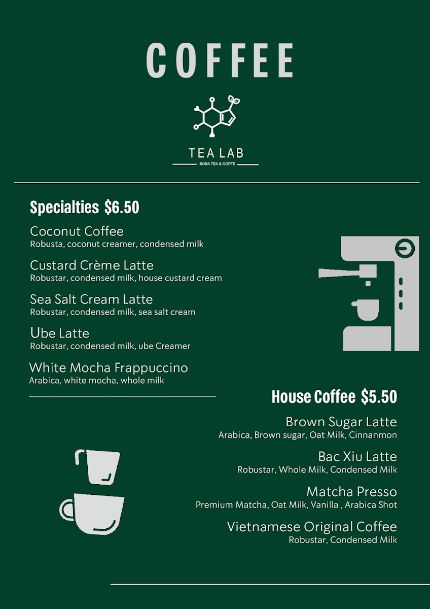 Tea Lab’s menu offers a vibrant array of beverages, blending refreshing fruit teas, fizzy drinks, frappés, milk teas, cheese teas, and coffee creations. Their Fruit Teas include tropical options like Tropical Lush, Guava Paradise, and Passion Fruit Cup, alongside Honeydew Refresher and Lychee Romance. For those seeking a fizzy twist, the Yuzu Fizzy, Strawberry Fizzy, and Lychee Club are standout choices, with Dragon Fruit Fizzy adding an exotic touch. Tea lovers can indulge in creamy Frappés such as Matcha Frappé, Strawberry Yogurt, and Mango Yogurt, or enjoy more indulgent options like Strawberry Frappé and Taro Frappé. For a milk tea experience, Classic Milk Tea, Taro Brûlée, and Milky Matcha are top picks, along with unique offerings like Oreo Cream and Milky Mango. The Cheese Teas showcase rich flavors like Rose & Cream, Mango Cheese, and Strawberry & Cream, with the bold Cheese Matcha as a standout. The Coffee section features inventive drinks like Ube Latte, Brown Sugar Latte, and Vietnamese Original Coffee, while those craving something a bit different can try the Custard Cream Latte or the strong Matcha Presso. For a more traditional tea experience, Jasmine Green Tea, Honey Green Tea, and Oolong Brew Tea provide a soothing, aromatic option. Tea Lab’s diverse menu ensures there’s something for everyone, whether you’re craving something fruity, creamy, or caffeinated.